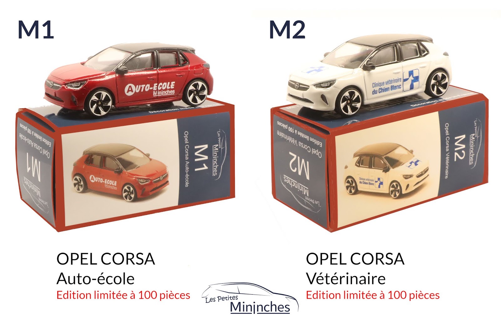 C'est ainsi deux Opel Corsa qui sont disponibles avec des décorations inédites et exclusives signées Les Petites Mininches. Les boites sont également inédites et reprennent d'ailleurs le style des boites historiques de Majorette. Concernant les miniatures, il faut noter que les teintes : rouge et blanche sont des teintes exclusives pour Opel. Ses dernières sont disponibles uniquement via les concessionnaires de la marque. Les modèles possèdent d'ailleurs une finition complète par rapport à la version orange qui vient d'intégrer la gamme "StreetCar" de Majorette.