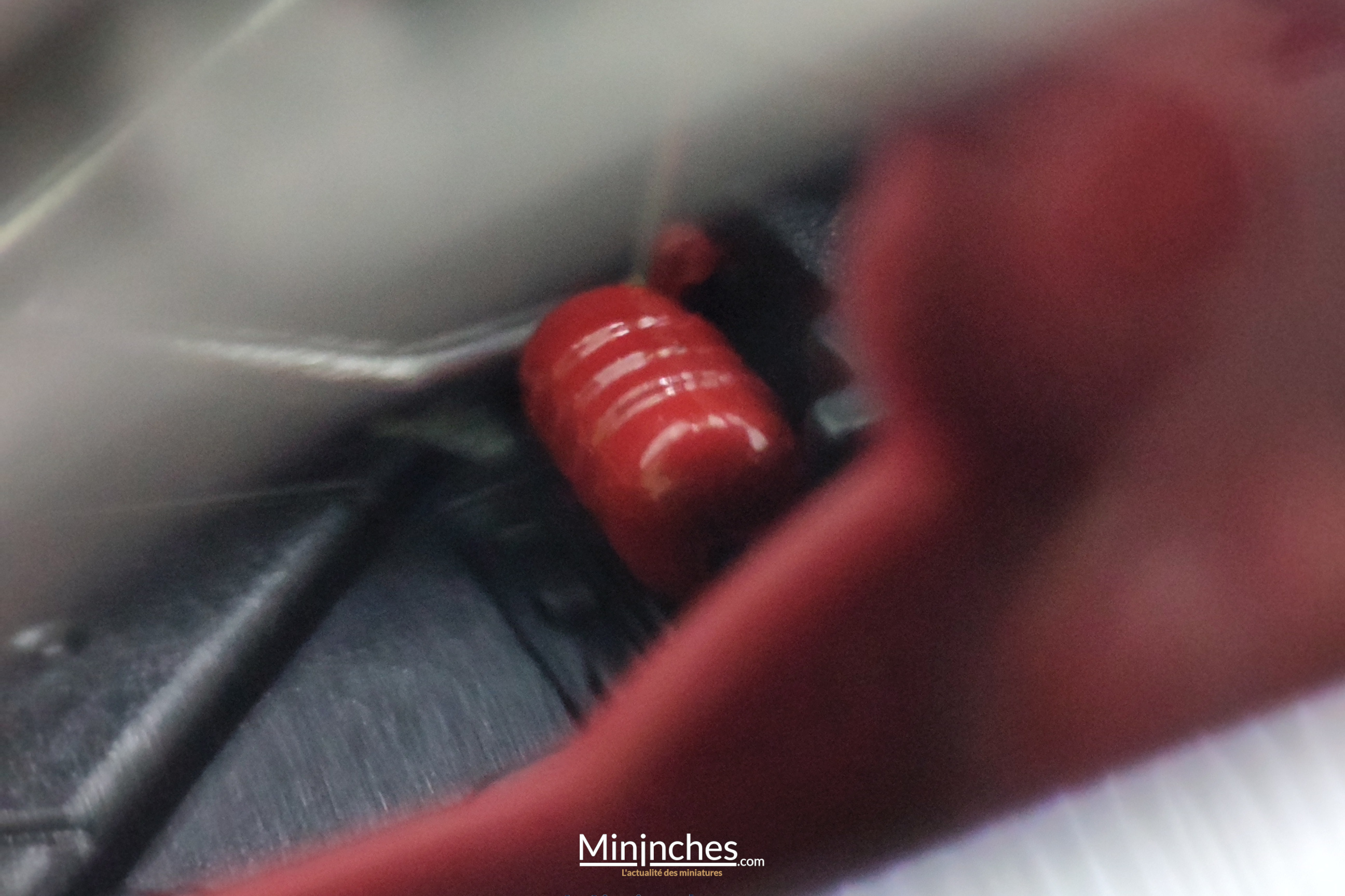 Pour les détails extérieurs, la miniature n'a pas tant à rougir par rapport à d'autres productions premium, tout y est et est finement réalisé comme les feux, la calandre ou l'échappement. Sur les deux ailes arrière au niveau du coffre on distingue même les trappes pour le carburant. La différence notable avec la voiture du jeu est au niveau du coffre à l'arrière où on distingue un crochet d'attelage rouge et un objet noir à la place de la plaque d'immatriculation que je ne saurais bien distinguer. Il s'agit bien évidemment d'un aménagement prévu par le fabricant pour réaliser la version course de la voiture.