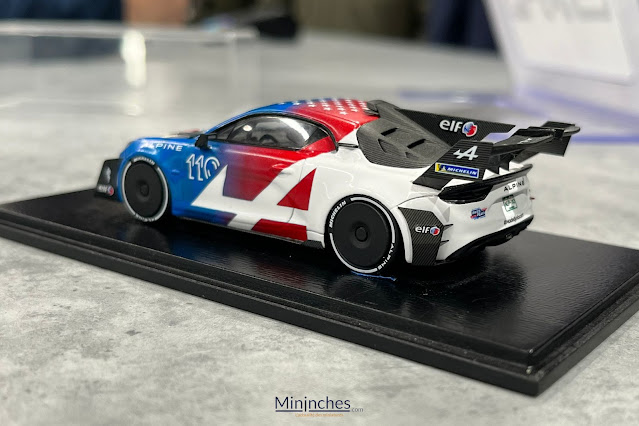 Ce modèle qui ne laisse pas indifférent de part ses appendices et sa décoration va prochainement être proposé par Alpine en miniature grâce à une production Spark 1/43. Nous avons pu approcher le prototype à l'occasion des 24h du Mans puisque ce dernier était en exposition par la marque ! Le moule semble très bien proportionné avec les nombreuses caractéristiques uniques de l'A110 Pikes Peak, et les décorations restent encore ici à l'état de prototype mais seront à la hauteur des productions Spark.